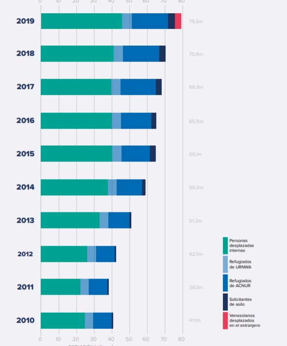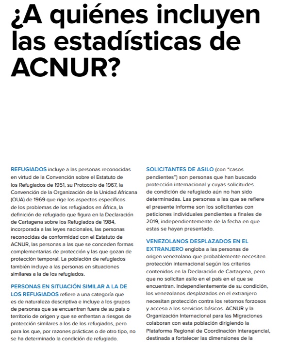 En rigor, esta nueva categoría se introdujo a partir del informe de Acnur de 2018 (publicado en 2019), pero en 2020 es la primera vez que aparece representada de manera separada en los gráficos oficiales de la agencia de ONU junto a las otras clasificaciones habituales (refugiados, desplazados internos, solicitantes de asilo).