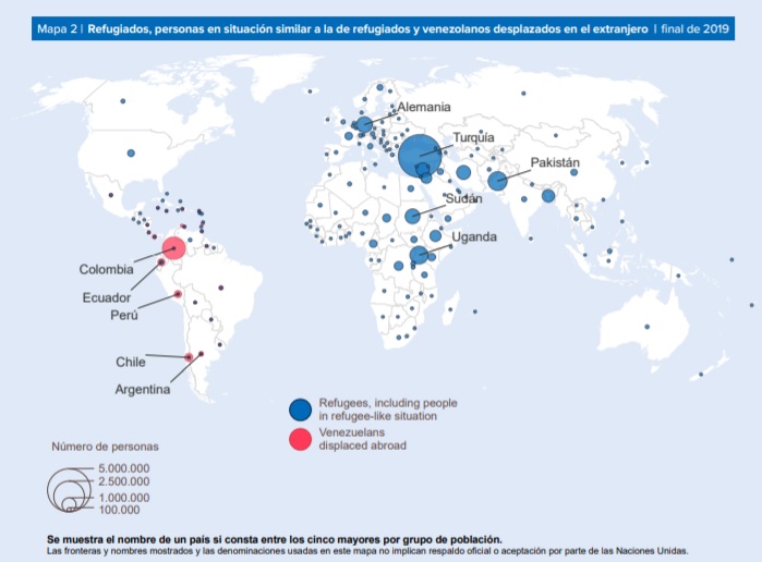 Si se suman a los 3,6 millones de "venezolanos desplazados en el exterior" con sus 93.300 refugiados oficiales —la mayoría de ellos reconocidos bajo ese estatus en Brasil— y sus 794.500 solicitantes de asilo, Venezuela llega al Día Internacional del Refugiado de 2020 como el segundo país con más desplazamientos internacionales forzados de todo tipo del mundo, con 4,5 millones de personas, solo detrás de Siria (6,7 millones).