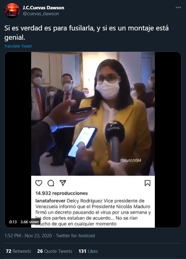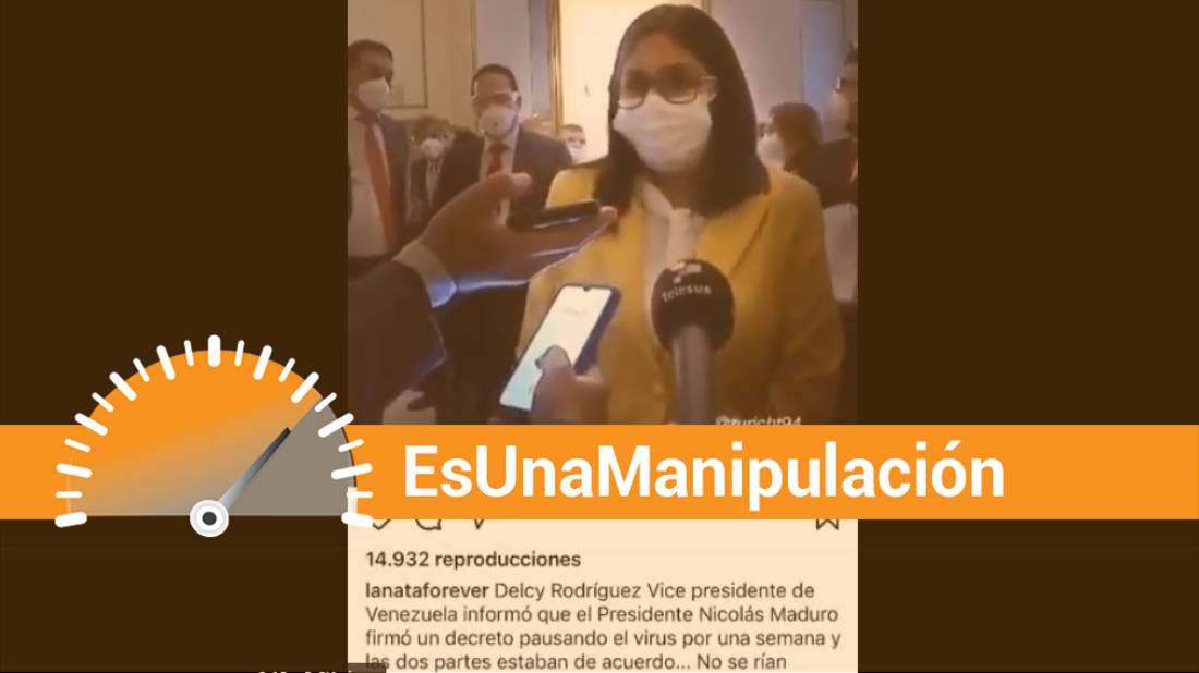 En Twitter se viralizó un video en el que aparece la vicepresidenta del gobierno de Nicolás Maduro, Delcy Rodríguez, supuestamente diciendo que "el virus será pausado a partir de mañana hasta el domingo, o sea que estás libre, que puedes salir a la calle, no vas a tener problema de contagio ni nada porque ellos firmaron un convenio con ese virus”.
