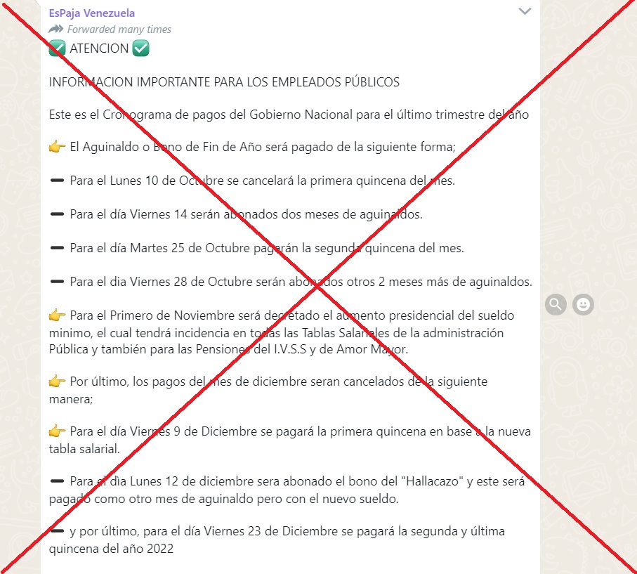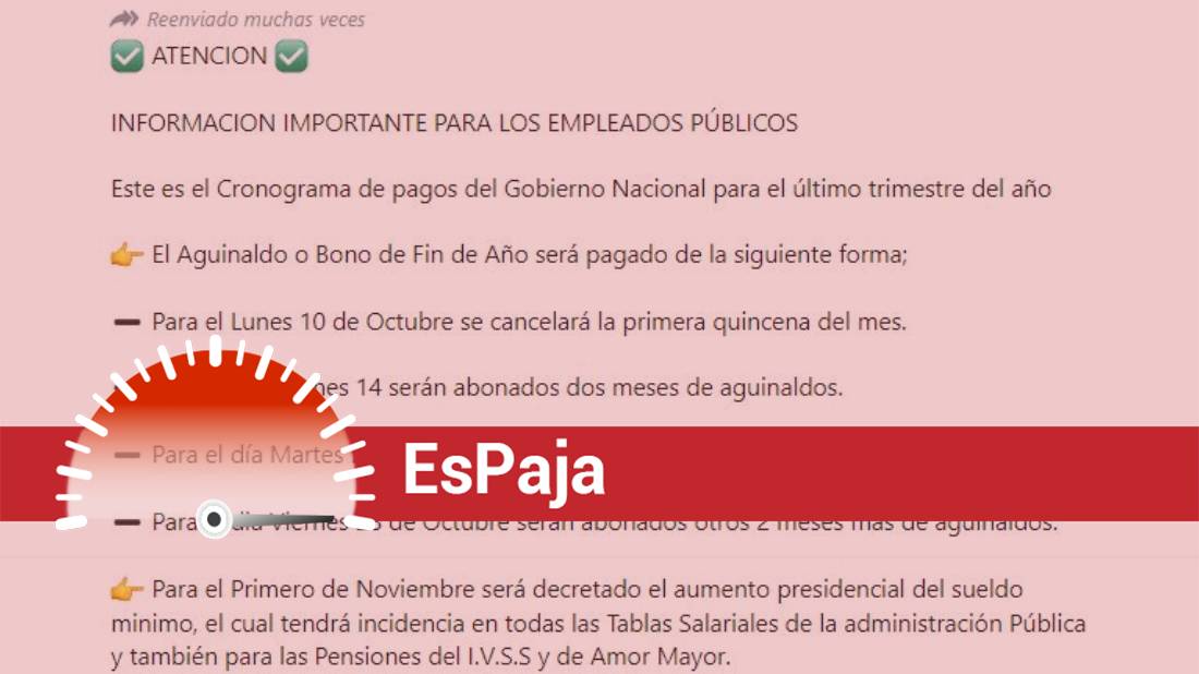 Este presunto cronograma de WhatsApp también ha sido públicado en un portal de escaso peso informativo llamado La Revista del Tuy (29 de septiembre de 2022) y en algunas páginas de Facebook. No se trata de una publicación oficial. Los empleados públicos deben tener cautela ante este anuncio engañoso. Contiene imprecisiones y hechos que carecen hasta el momento de confirmación oficial.