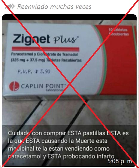 En febrero de 2022 circula por Whatsapp una imagen del fármaco Zignet Plus a la que se le superpone el siguiente texto: "cuidado con comprar ESTA pastillas ESTA es la que ESTA causando la Muerte esta medicinal te la estan vendiendo como paracetamol y ESTA probocando infarto (sic)". La información es engañosa.