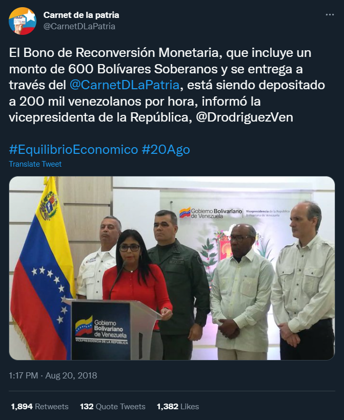 El "bono de reconversión económica" fue entregado en 2018, cuando el gobierno le quitó cinco ceros a la moneda y la rebautizó como "bolívar soberano". El 17 de agosto de ese año, Nicolás Maduro hizo el anuncio con motivo de la reconversión monetaria.