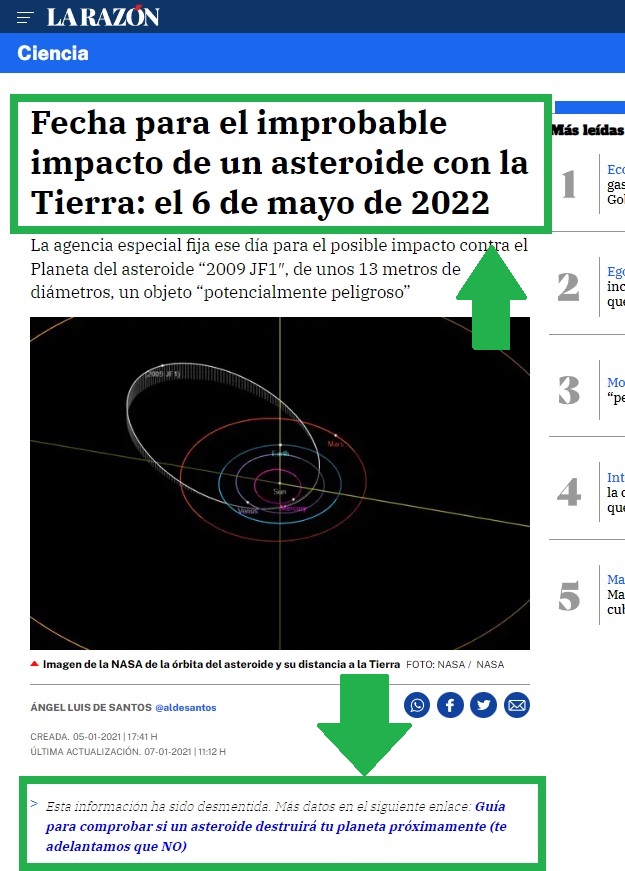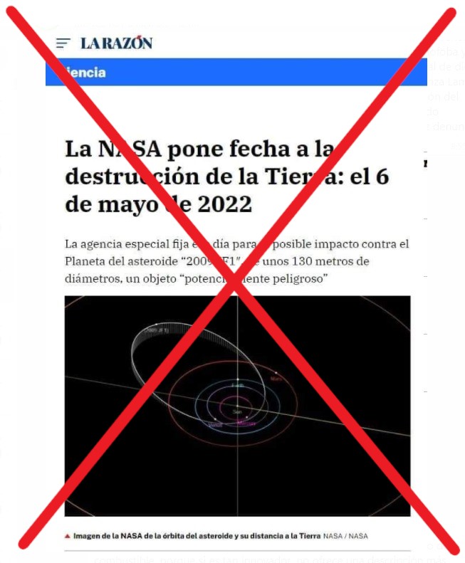 Lo que es totalmente falso es que alguna vocería o información pública emanada de NASA haya puesto fecha "a la destrucción de la Tierra", mucho menos el 6 de mayo de 2022.
