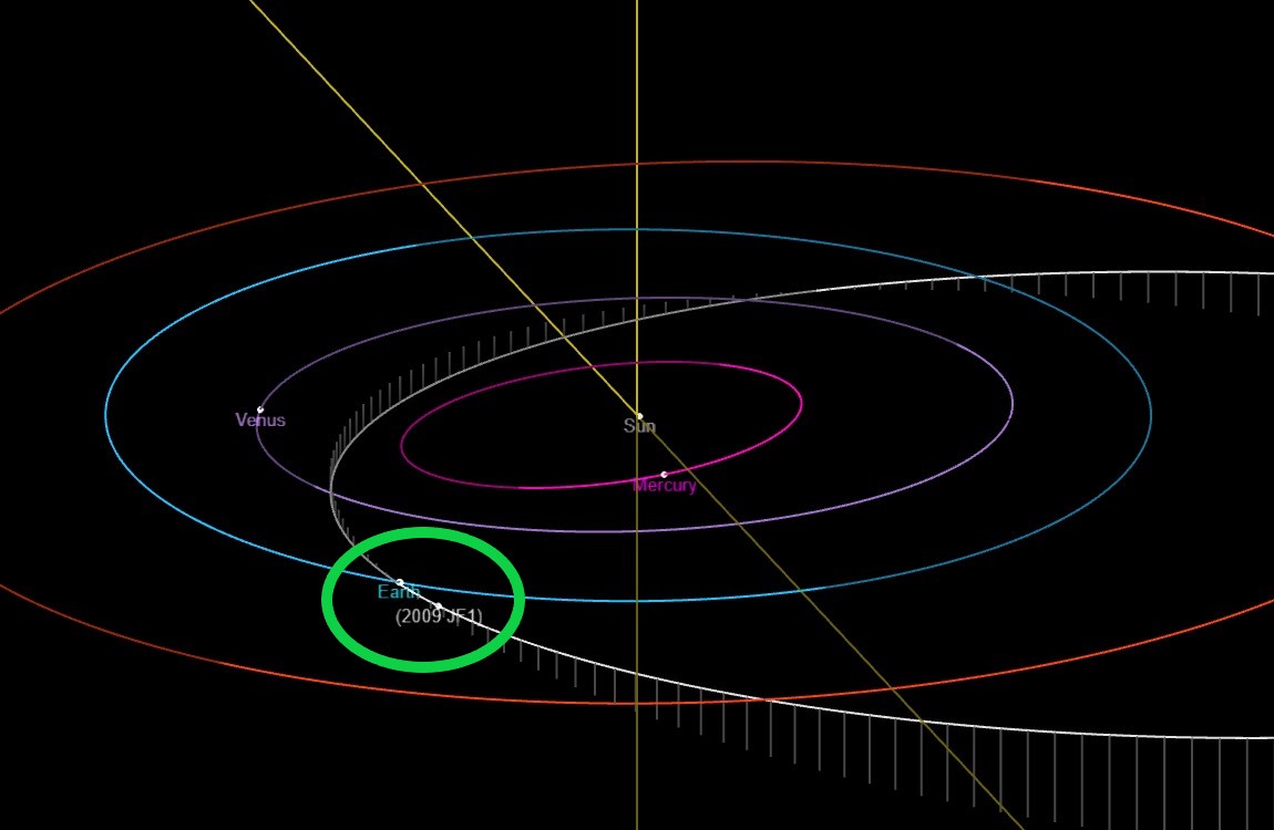 Tránsito más probable del asteroide 2009 JF1 para el 6 de mayo de 2021, según la información más reciente de la NASA (base de datos de pequeños cuerpos del Sistema Solar)