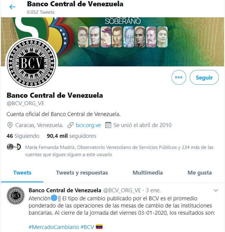 Captura de pantalla del Twitter oficial del BCV (8 de enero de 2020, 11:30 am)