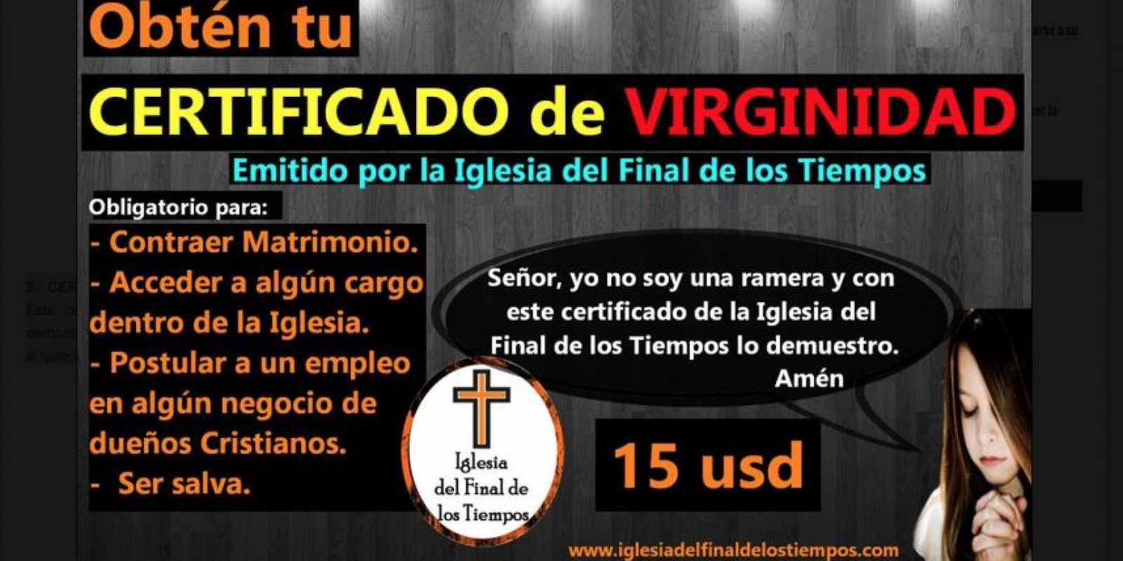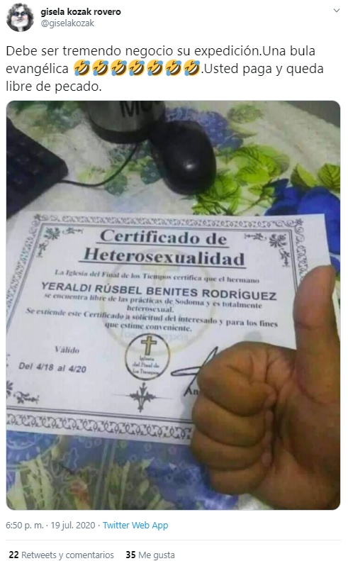 "Debe ser tremendo negocio su expedición: una bula evangélica. Usted paga y queda libre de pecado": el 19 de julio de 2020, la intelectual venezolana Gisela Kozak mostró en su cuenta de Twitter la imagen de un presunto certificado de heterosexualidad despachado por un culto cristiano que se identifica como Iglesia del Fin de los Tiempos. El documento —con vigencia de dos años y válido hasta abril de 2020— hace constar que un hermano identificado con nombre y apellido "se encuentra libre de las prácticas de Sodoma y es totalmente heterosexual". Kozak divulgó este insólito hallazgo más en tono de broma que de denuncia contra la intolerencia ante la diversidad sexual.