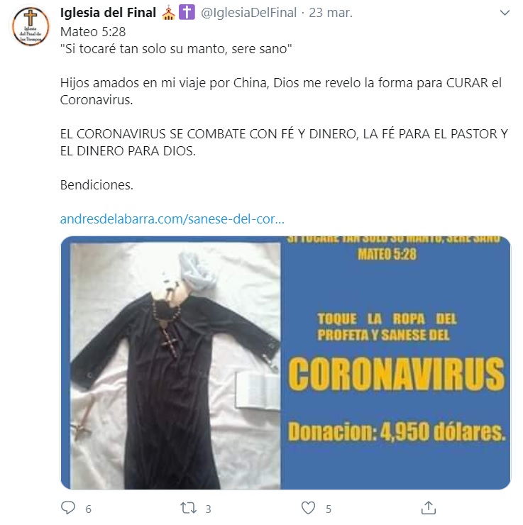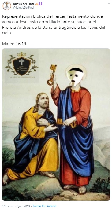 Pero... ¿la Iglesia del Fin de los Tiempos es un culto cristiano protestante organizado? Si hacemos una búsqueda en redes sociales, en Twitter nos encontramos con la cuenta @IglesiaDelFinal, que tiene 2.172 seguidores —una cifra relativamente modesta— y hace referencia a un profeta enmascarado identificado como Andrés de la Barra (@ElProfetaAndres), "el sobrino consentido de Dios". También hay páginas en Facebook, una cuenta en Instagram y un canal de YouTube. En todas se exige religiosamente la práctica del diezmo: entregar 10% de las ganancias personales a la congregación, entre otros pagos en cash.