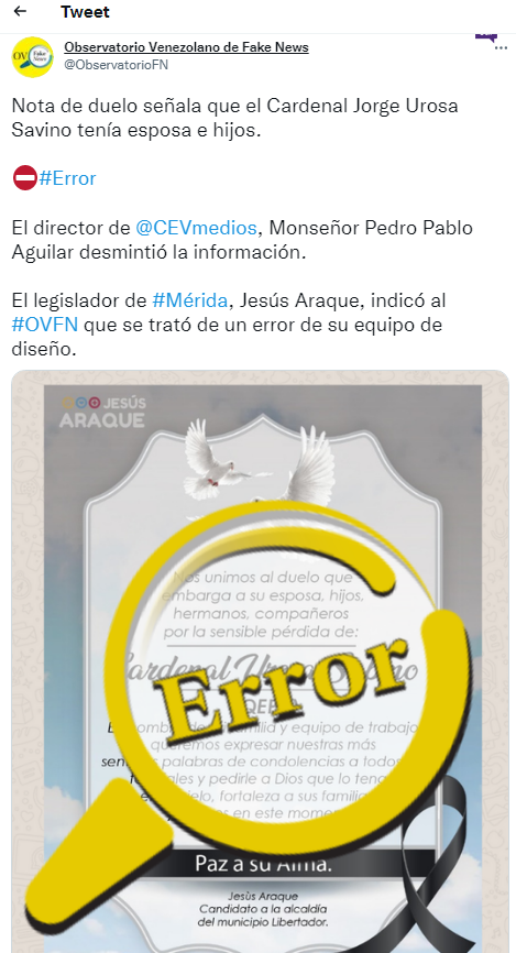 EsPaja intentó comunicarse con Araque vía redes sin tener respuesta. En horas de la tarde de este viernes 24, el candidato le confesó al Observatorio de Fake News que sí habían publicado el obituario en el que mencionan a la supuesta esposa e hijos de Urosa Savino y que había sido un error de su equipo de diseño.
