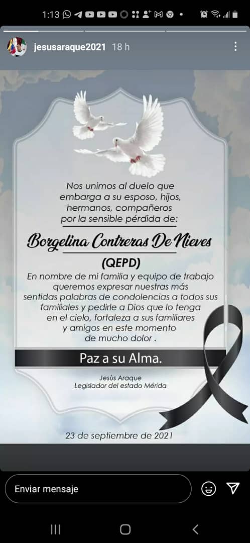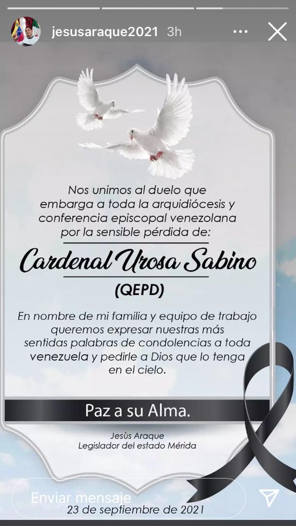 Anterior a este obituario para el cardenal Urosa, aparece en las historias de Instagram de la cuenta de Araque un obituario para la señora Borgelina Contreras en el cual se le da el pésame a su esposo e hijos, con la misma plantilla gráfica.