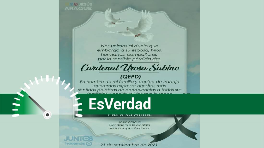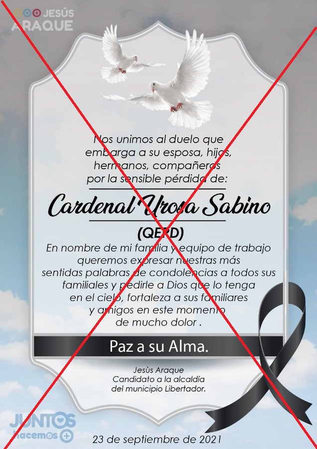 El equipo de EsPaja no encontró ese obituario en las redes del legislador regional, pero sí encontró un obituario en honor al Cadenal Urosa Savino sin nombrar a la supuesta esposa e hijos , dirigiendo el pésame a la Arquidiócesis de Caracas y, esta vez, no firmado por el candidato Jesús Araque, sino por Jesús Araque en su condición de Legislador del estado Mérida. En todos los casos se repitió otro error: la manera en que se escribió el apellido Sabino, cambiando una letra.